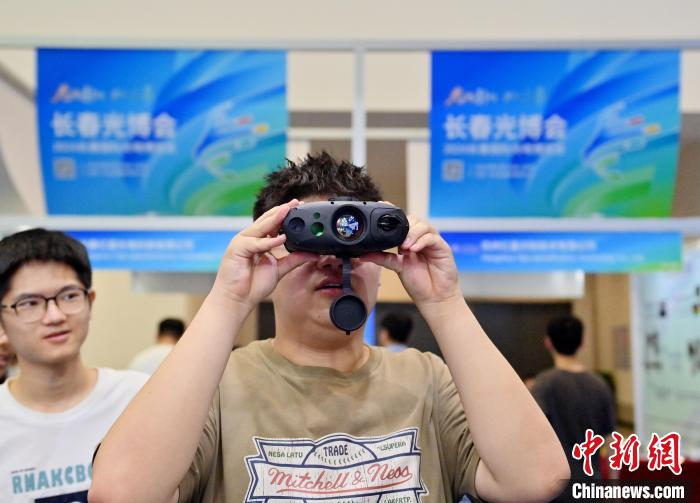 6月18日,2024长春国际光电博览会在长春开幕,博览会覆盖“芯、光、星、车、网”五大领域13个产业方向,全面展现中国最前沿的光电科技,以及实际应用领域等内容。图为参观者在体验三光高清手持热像仪。中新社记者张瑶摄