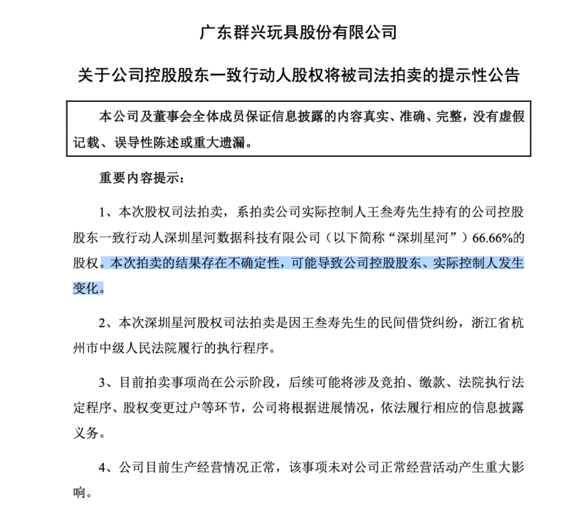 群兴玩具在公告中表示,本次拍卖的结果存在不确定性,可能导致公司控股股东、实际控制人发生变化。公司目前生产经营情况正常,该事项未对公司正常经营活动产生重大影响。