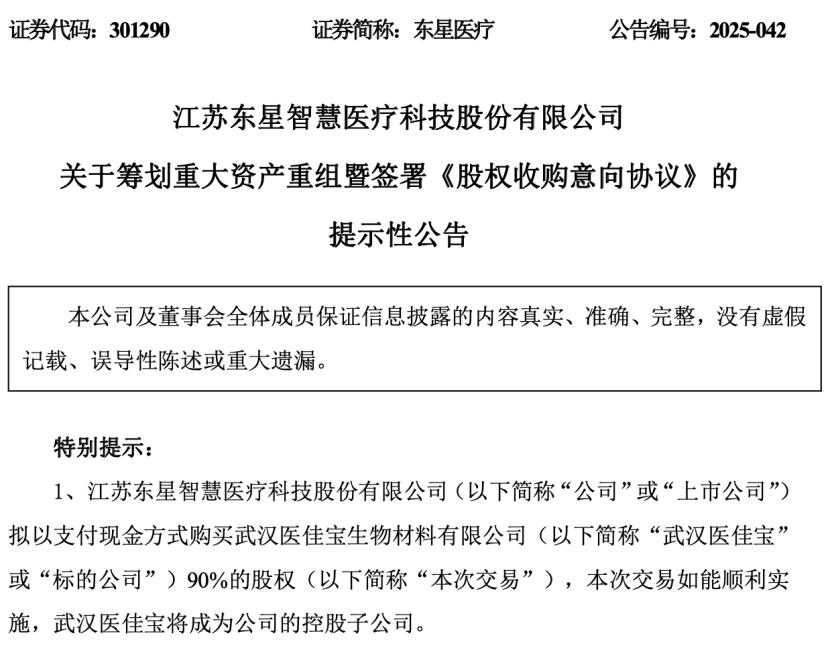 目前,此次交易尚处于初步筹划阶段。9月26日,东星医疗已经与武汉医佳宝全体股东签订了《股权收购意向协议》,但最终收购股权比例、交易对方及交易价格尚需交易各方进一步协商后确定。